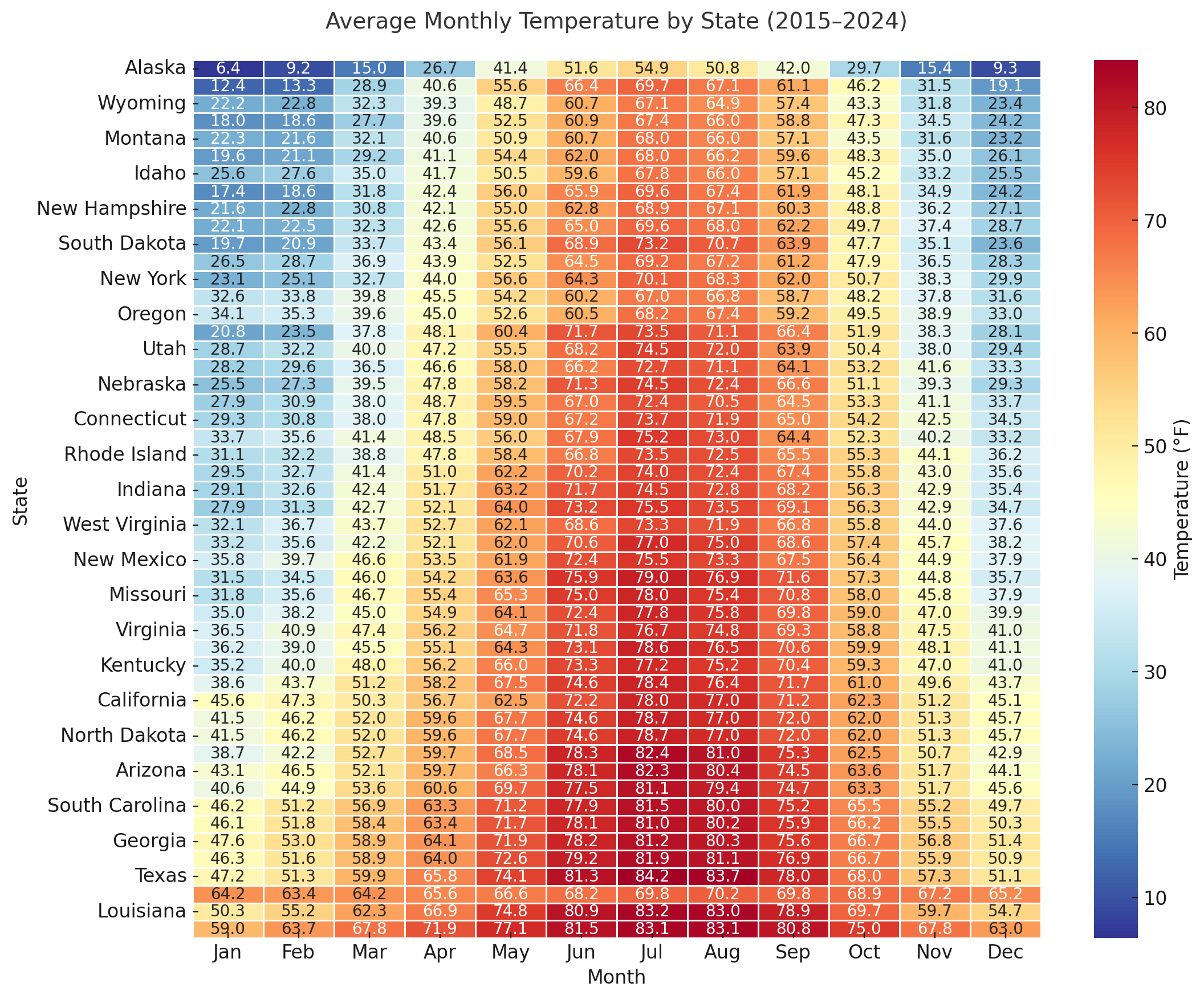 The resulting heatmap should clearly highlight seasonal and regional temperature variations across the United States over the specified period.