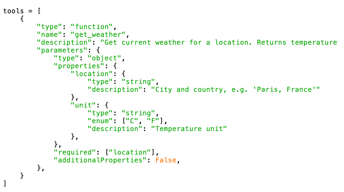 Tools are defined using JSON schema that tells the model what functions are available, what they do, and what parameters they accept. The schema includes: