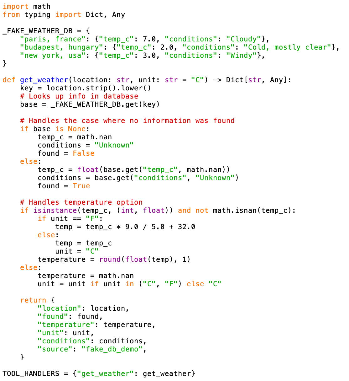 This implementation defines a fake database _FAKE_WEATHER_DB and then defines a Python function get_weather that looks up weather information in the dataset guided by location and unit inputs. The implementation handles edge cases properly: unknown cities return NaN for temperature and include a found: False flag, making it clear to the model that the data was unavailable.