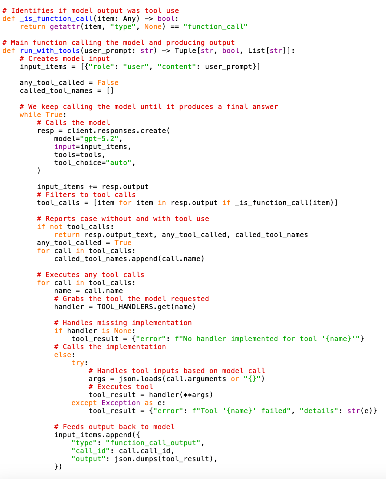 - Repeat until the model produces a final text response (which happens when it outputs text without calling any tools).