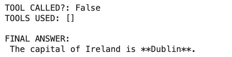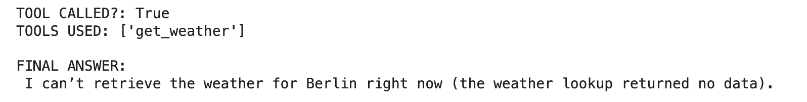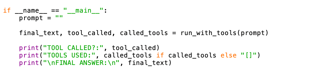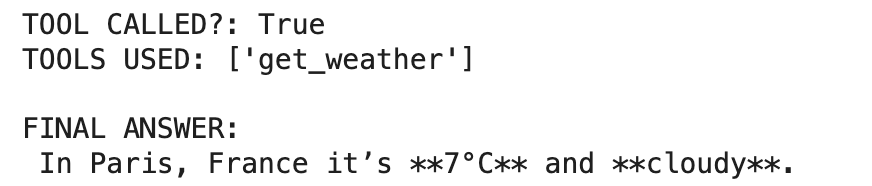 The function returns three values: the final answer text, whether any tools were called, and the list of tool names used. This makes it easy to log or debug the model's behavior.
