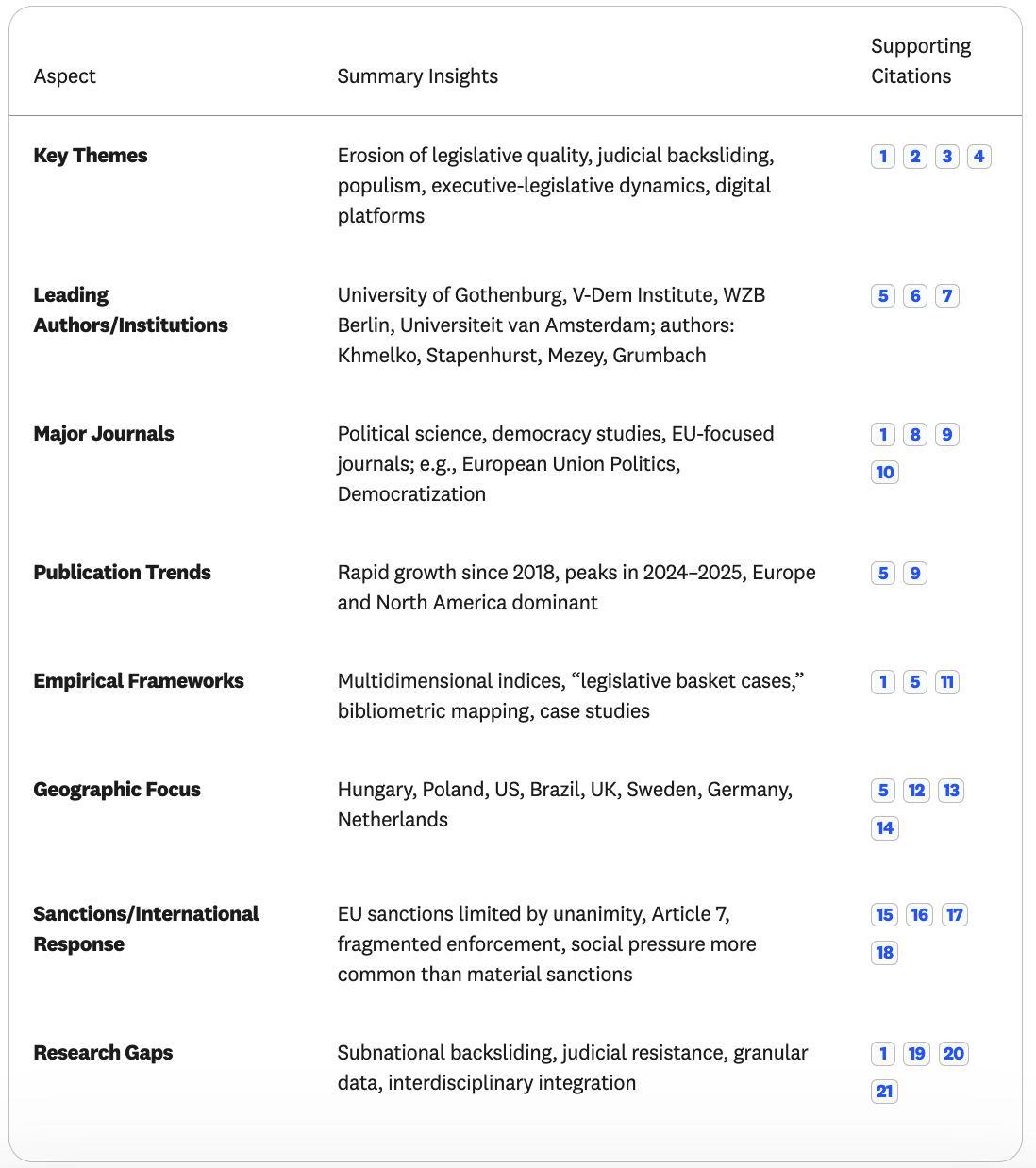Provide an overview of the academic literature on legislative backsliding published in the last 10 years based on Scopus-indexed peer-reviewed journal articles. Identify key themes, leading authors, major journals, and publication trends.