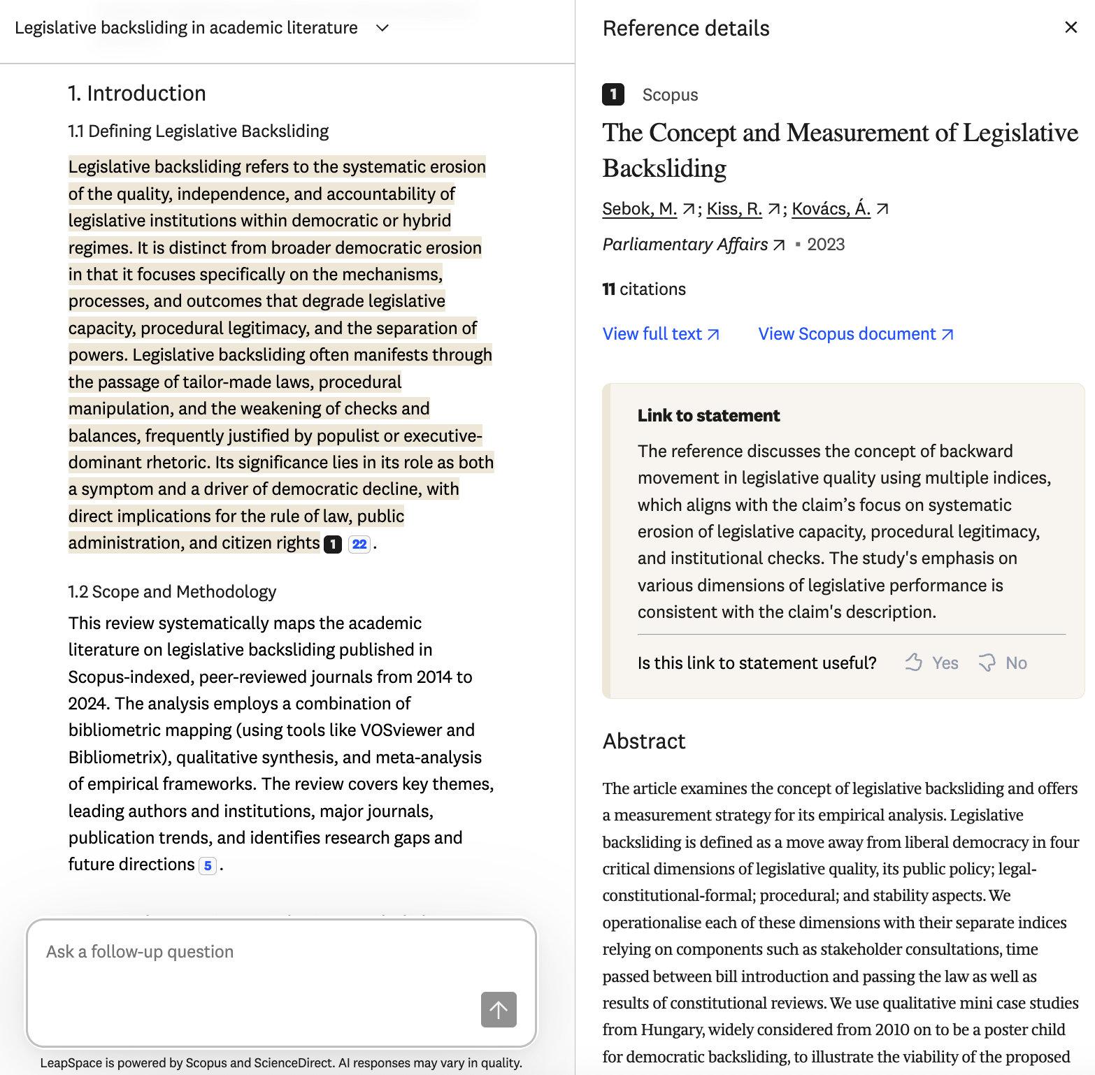 LeapSpace is most valuable for structured, Scopus-based literature mapping, citation tracking, and field overviews. It is particularly useful for identifying themes, key authors, and citation networks within indexed academic journals. However, it reflects the limits of the Scopus corpus and produces AI-generated summaries that may contain inaccuracies. It should therefore be used as a research accelerator—supporting, not replacing, direct reading and scholarly verification.