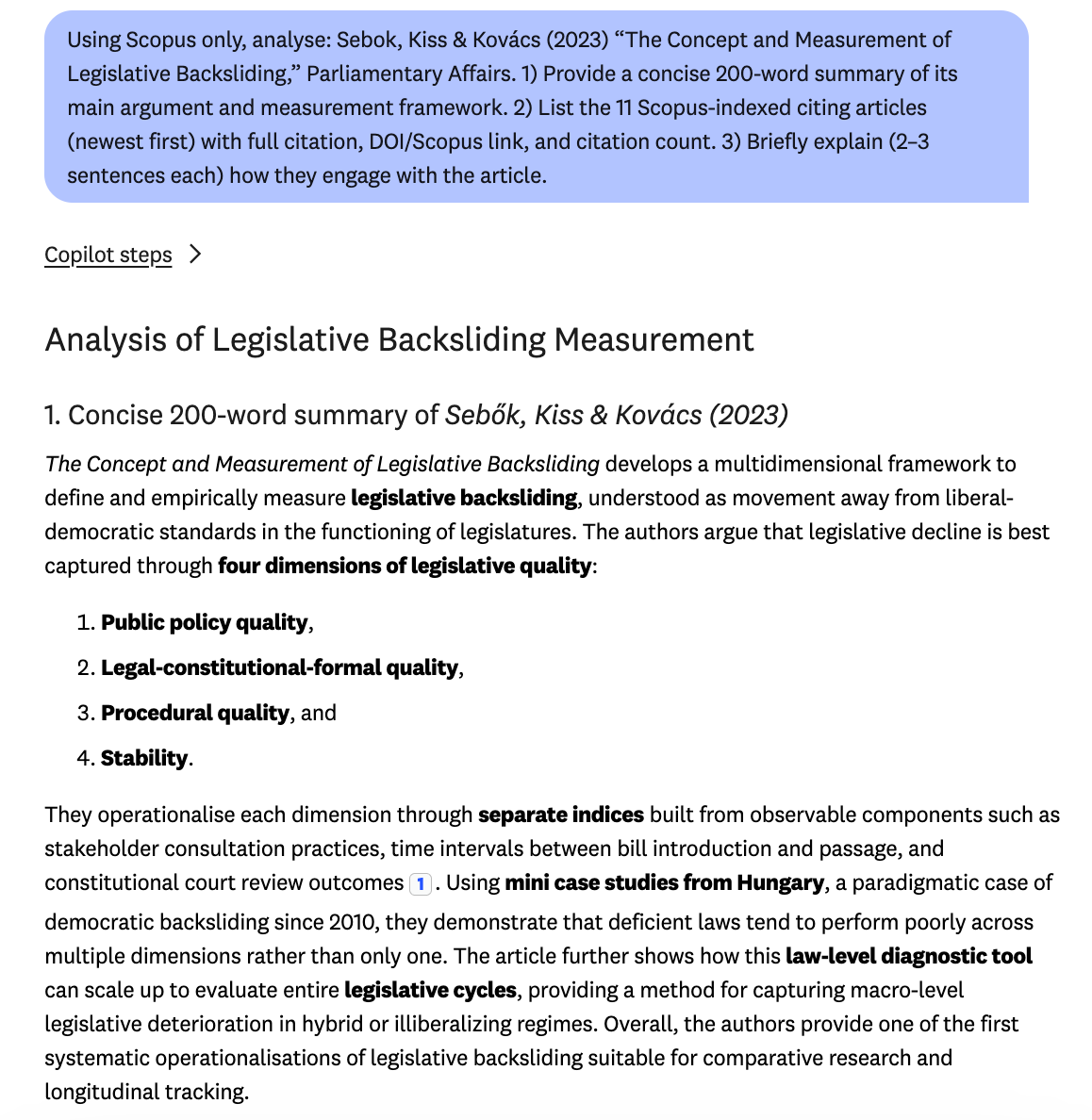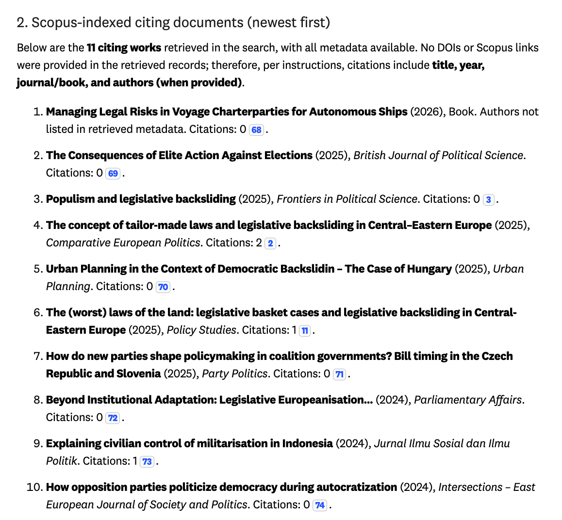 Importantly, the system remained strictly within the Scopus corpus. No grey literature, policy reports, SSRN working papers, or non-indexed law reviews appeared in the reference list. The output, therefore, reflects the boundaries of the indexed academic ecosystem rather than the broader intellectual debate.