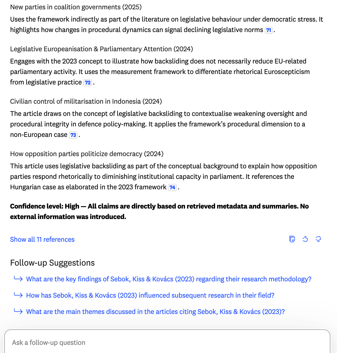 The system listed all 11 Scopus-indexed citing documents (newest first), and for each it briefly explained how the article engages with Sebők, Kiss & Kovács (2023)—whether by applying the measurement framework, extending it conceptually, or using it as contextual background.