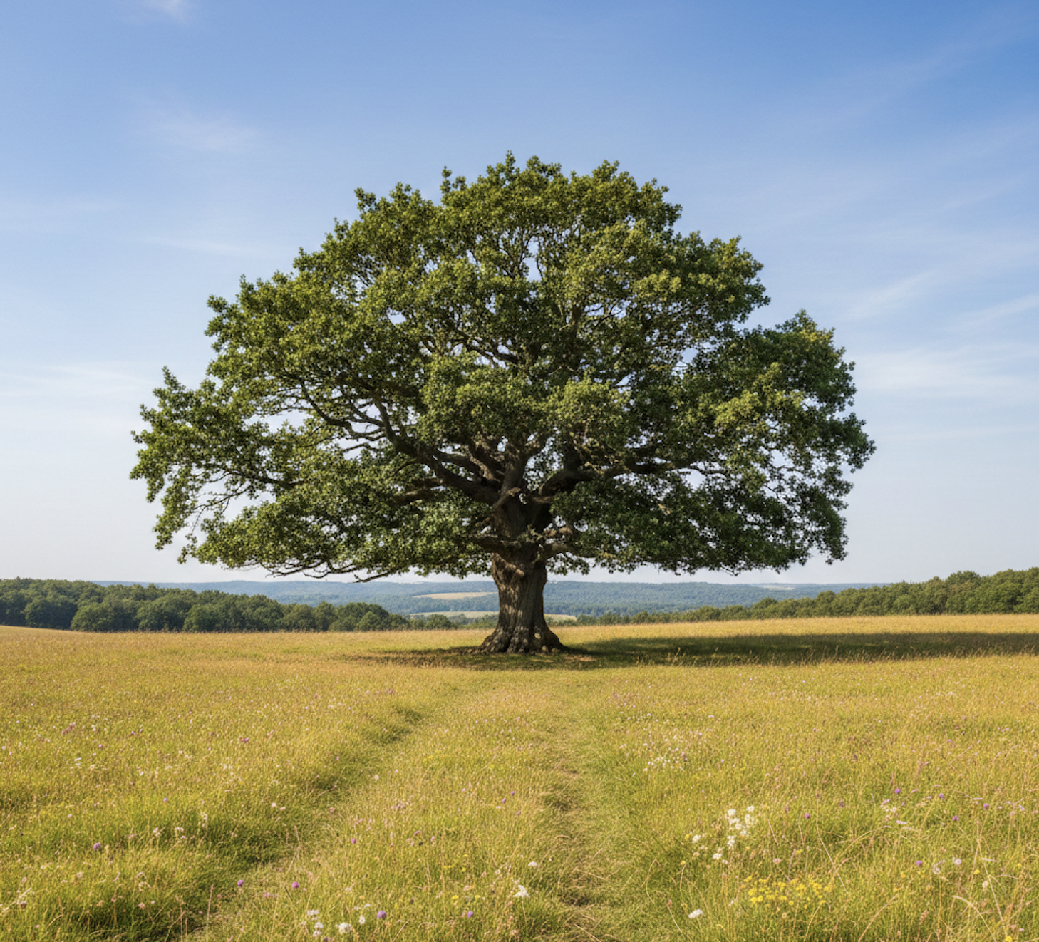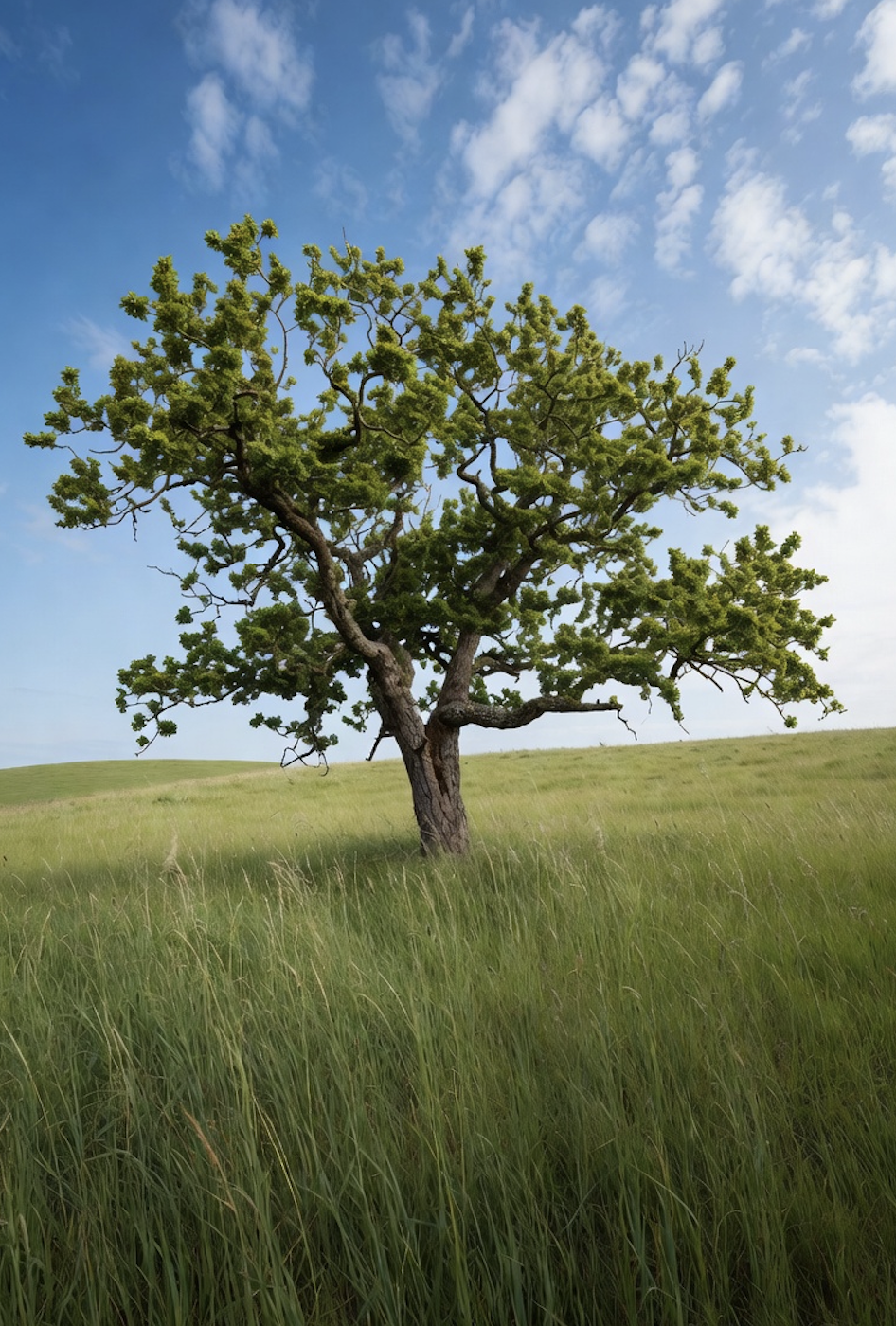 To establish a baseline for comparison, we collected one authentic photograph depicting a similar scene: a mature oak tree in an open meadow. This image served as the non-AI control in our test set.