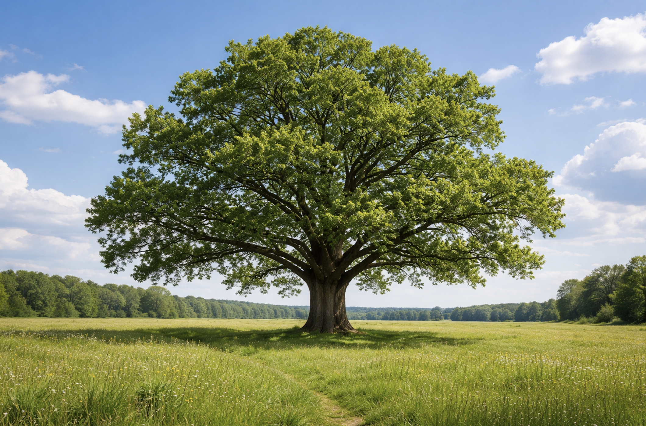 Generate a photorealistic image of a single mature oak tree standing alone in the middle of a meadow, natural midday lighting, wide shot, realistic colors and detail, no people, no buildings, no animals, no text.