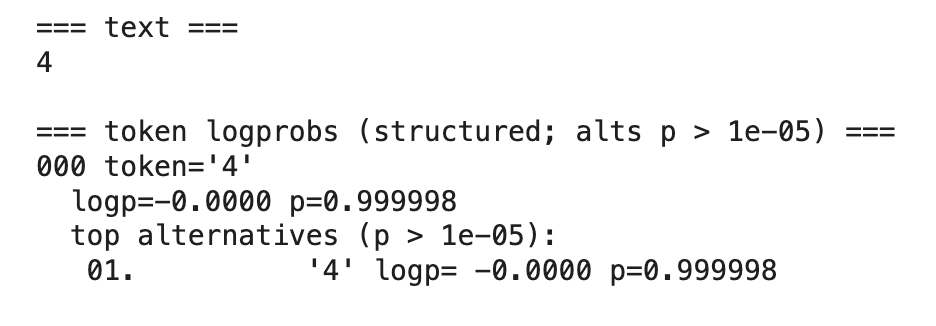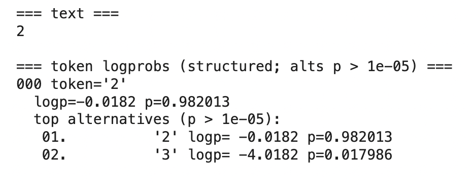With this last example, we illustrate a critical limitation of logprobs. The model confidently answers "2" with p=0.982013, yet the correct answer is "3" (appearing as an alternative with only p=0.017986). The word "strawberry" contains three instances of the letter 'r', but the model's high confidence masks its error. This demonstrates that logprobs measure the model's certainty about what it predicts—not the correctness of that prediction.