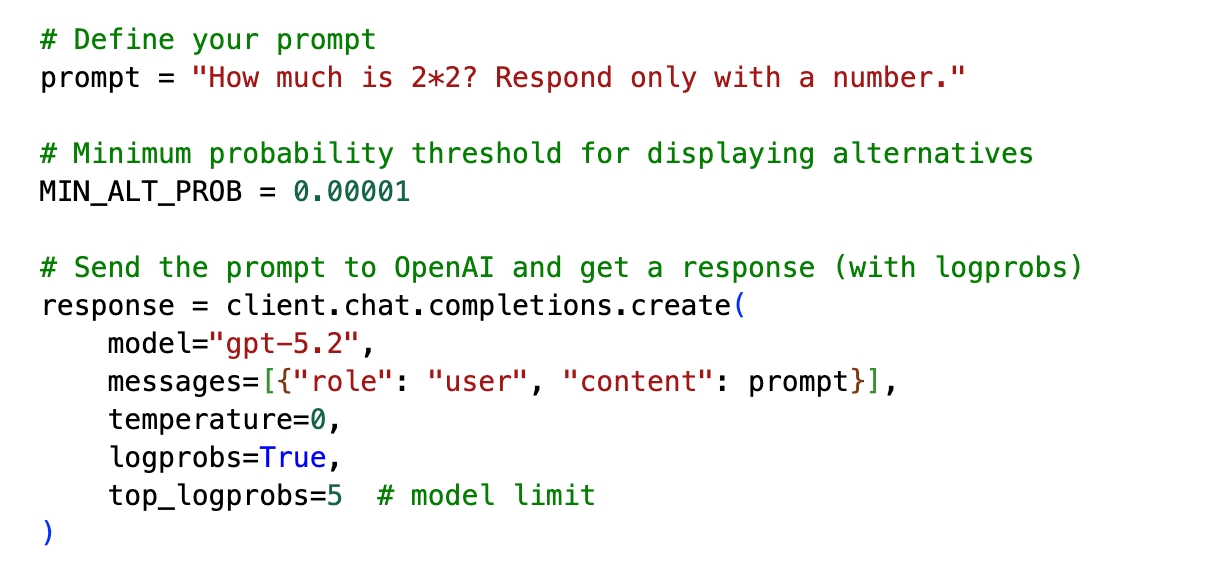 This handles the following tasks: 1) it defines the prompt we send to the model, 2) sets a minimum probability threshold (0.0001) under which the code does not display alternatives, and 3) specifies the details of the API request. In the specification, we set logprobs=True to enable log probability extraction and top_logprobs=5 to retrieve the top 5 alternative tokens at each position.