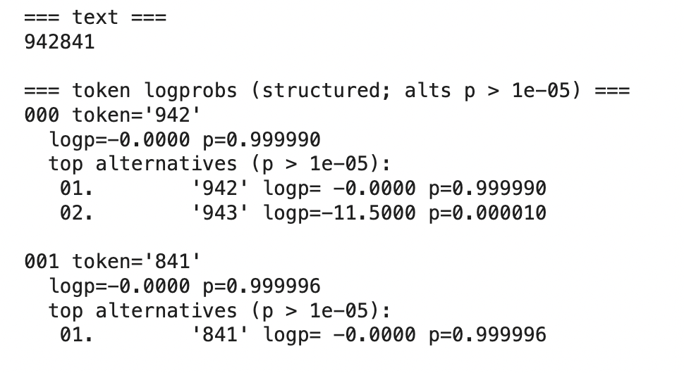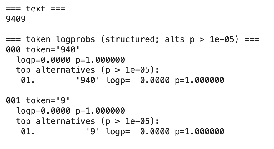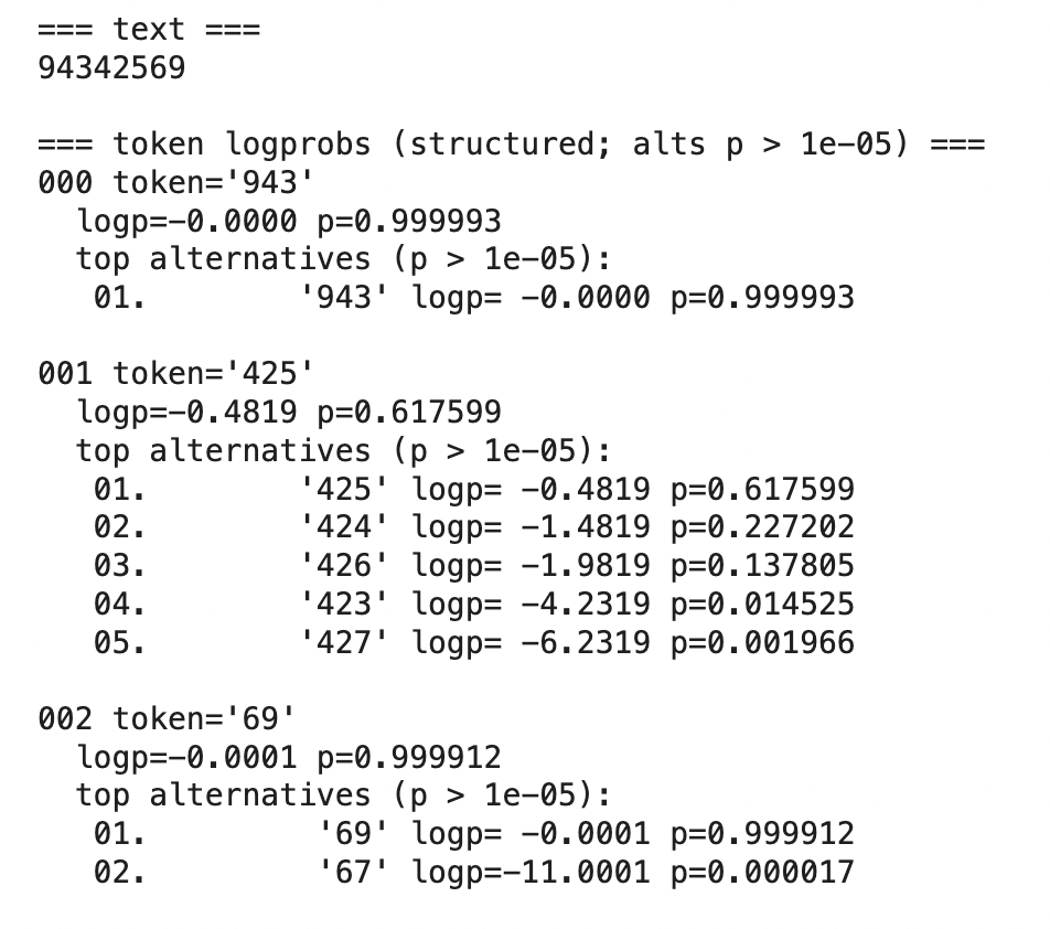 This is where logprobs first prove their diagnostic value. The model's answer (94342569) is incorrect—the correct answer is 94342369. Notice that the second token ('425') has a probability of only 0.617599, with '424' appearing as a strong – but, again, incorrect – alternative (p=0.227202). This distributional uncertainty correctly signals that the model is struggling with this calculation.