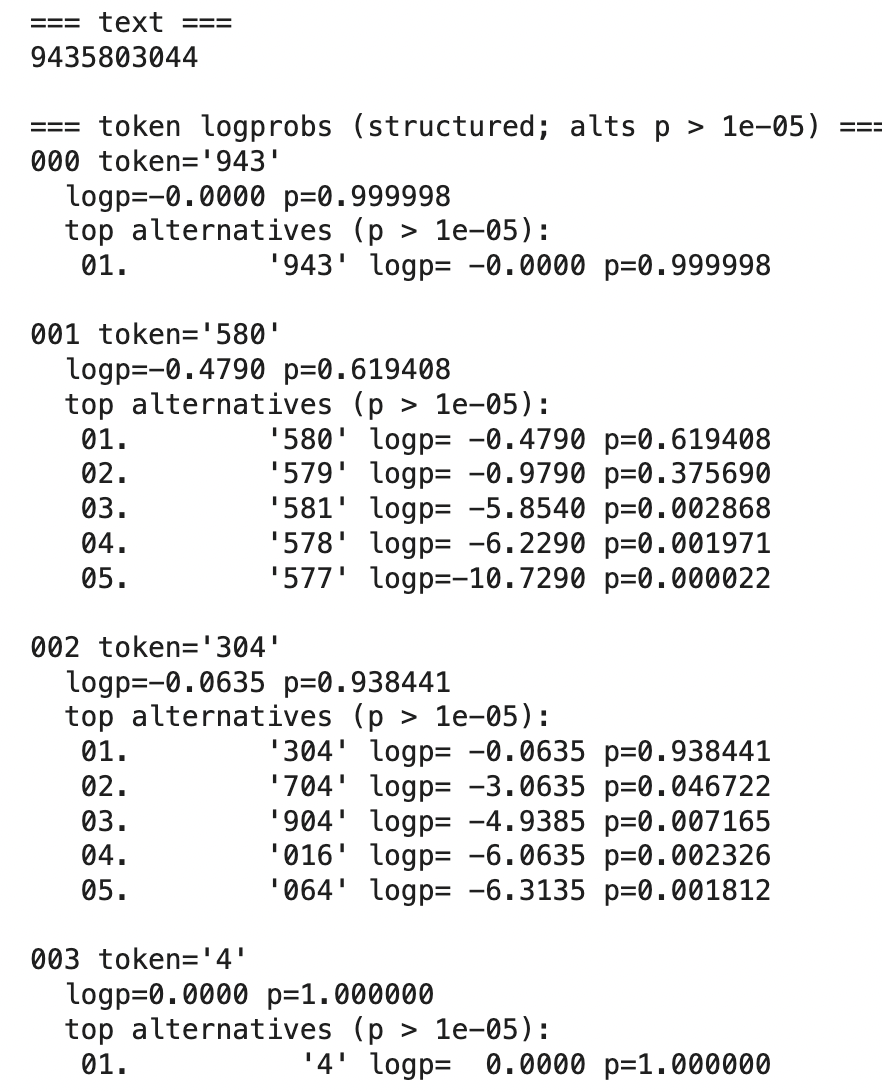 The model's answer (9435803044) is again incorrect. The logprobs reveal significant uncertainty at both the second token ('580', p=0.619408) and third token ('304', p=0.938441), with multiple plausible alternatives. This pattern of distributed probability across tokens can be seen as a warning for potential error.